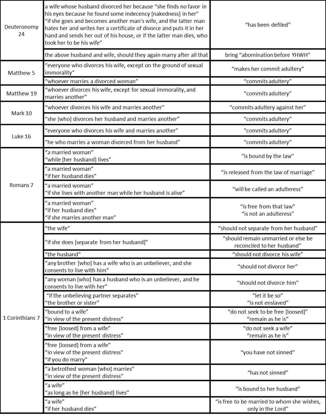 I recently had a lengthy discussion with some of my inner circle, a few of my most trusted friends, about failed and failing marriages, the obligations of the husbands and the wives involved in them, and the responsibility that their friends and family have toward them. In discussing divorce and remarriage, in light of both real and hypothetical situations, I found myself referring over and over again to the following passages, seeking an understanding of God’s expectations of those who are or have been married. I eventually made this chart for my own reference. I am trying to identify WHO is being talked about and WHAT is said about them, and I wanted it all in one place. It has been helpful to me. Maybe it will help you, too.
